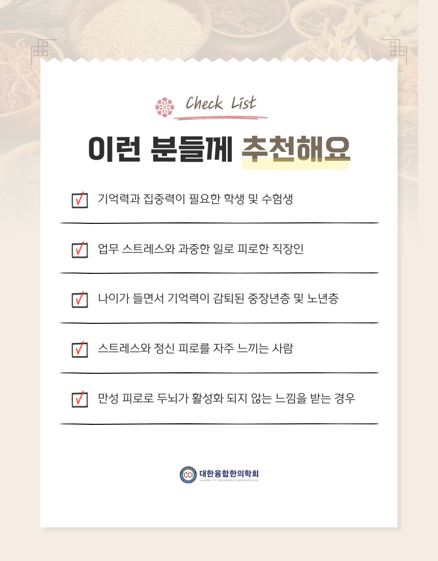 인삼, 백출, 복령, 진피, 황기, 당귀, 생지황, 천궁, 맥문동, 석곡, 감초, 백자인, 박하, 석창포, 원지, 교이, 올리고당