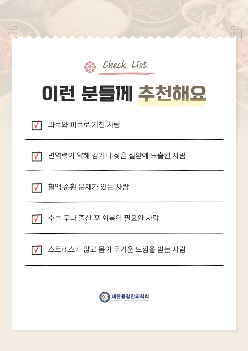 백작약, 숙지황, 황기, 당귀, 천궁, 대조, 생강, 육계, 사인, 백출, 진피, 감초, 교이, 올리고당